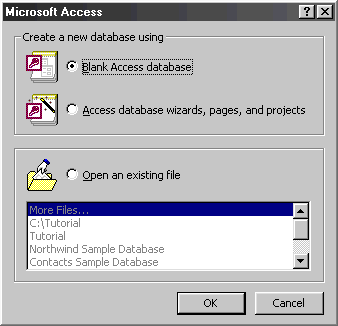 Blank Access Database radio button, and then click OK.