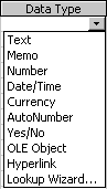 Text, Number, Date/Time, Currency, Yes/No, and AutoNumber. Text, Number, Date/Time, and Currency are
