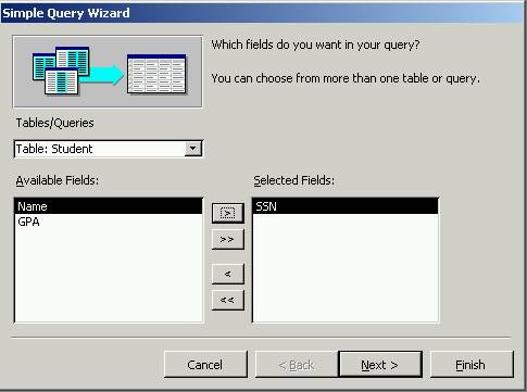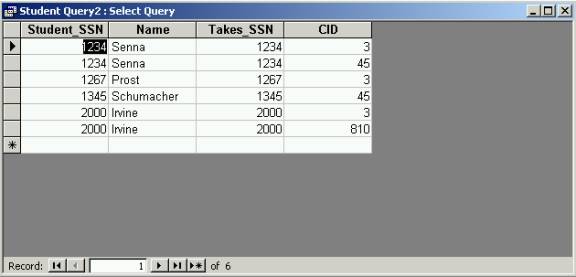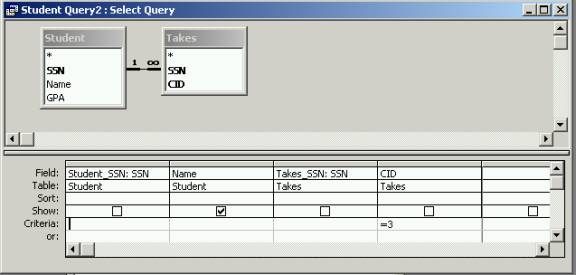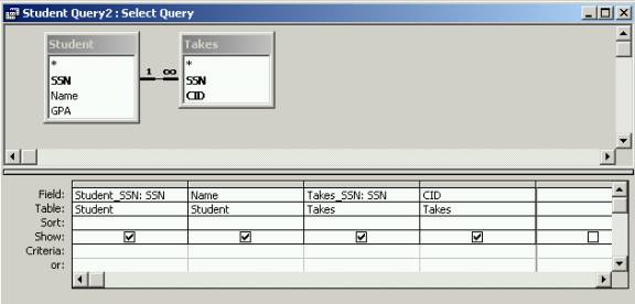 table. Select the Takes table and include the SSN and CID fields of this table