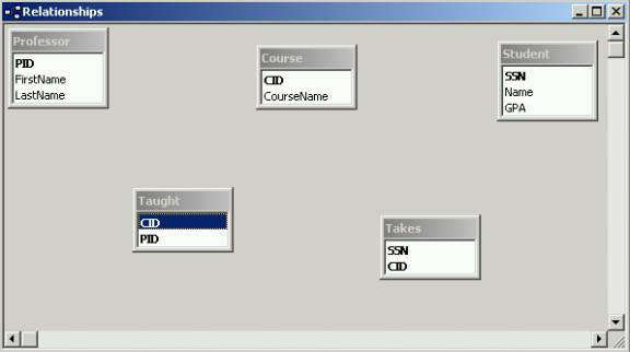 - View the Relationship window. The primary keys for all the tables