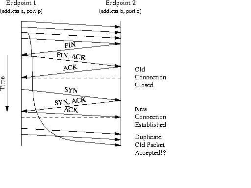 The TIME-WAIT state avoids the situation depicted in Figure 1. Arrows represent packets, and endpoints' time lines run down the page. Packets are labeled with the header flags that are relevant to connection establishment and shutdown; unlabelled packets carry only data.