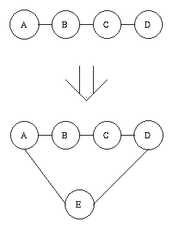 A was connected to D through B and C . Once E has been installed, A can connect to D through E . This line costs less. That's why E has to announce its existence to A . If E should ever crash, A must know about it. Otherwise it will continue to send datagram s through E . Unfortunately, a router can't always inform others, that it is about to crash. A router can't depend on such message to warn it. Therefore a router crash, must be learned in other ways. RIP forces a router to send update messages every thirty seconds. These messages contain routes, that that router knows; and their metrics. If a router does not receive an update message for 180 seconds. from another router. It assumes that router to be unreachable. This timeout of 180 seconds allow a router to miss five update messages, without being marked unreachable. This is necessary, because the media might be unreliable and loose datagrams.