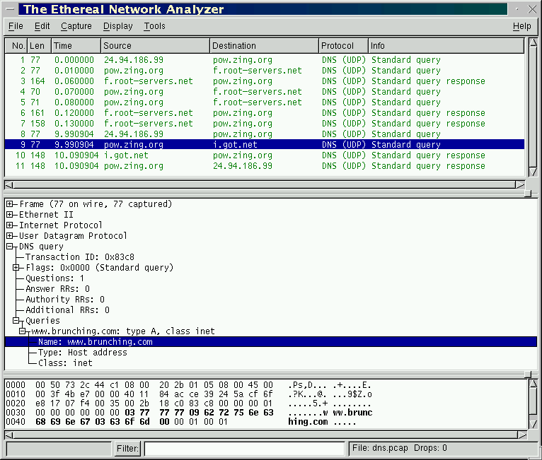 This shows a DNS lookup from the server's perspective. It's interesting to note that the server issued four queries to resolve the name, and the client re-sent its query before the server could respond.