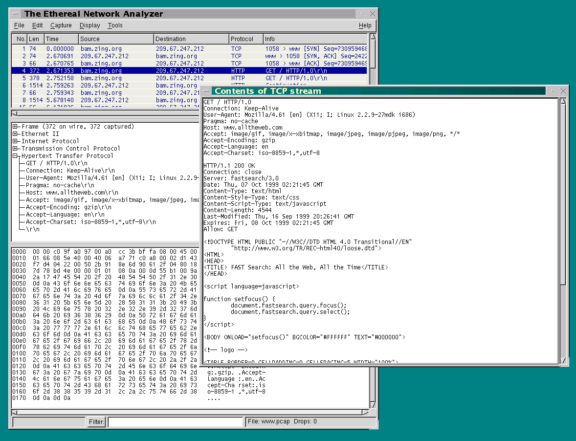 Wireshark is a free network protocol analyzer for Unix and Windows. It allows you to examine data from a live network or from a capture file on disk. You can interactively browse the capture data, viewing summary and detail information for each packet. Wireshark has several powerful features, including a rich display filter language and the ability to view the reconstructed stream of a TCP session.